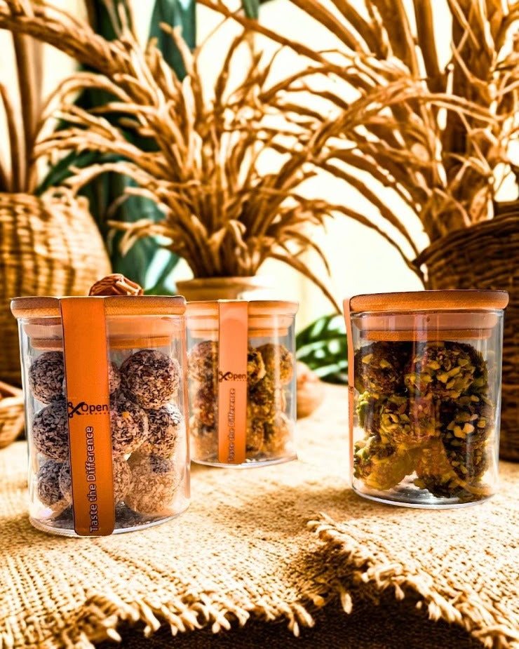 תמרים אורגניים מסוג מג'ול, שקדים, אגוזי מלך, פיסטוקים, זרעי צ'יה, זרעי פשתן וקוקוס.